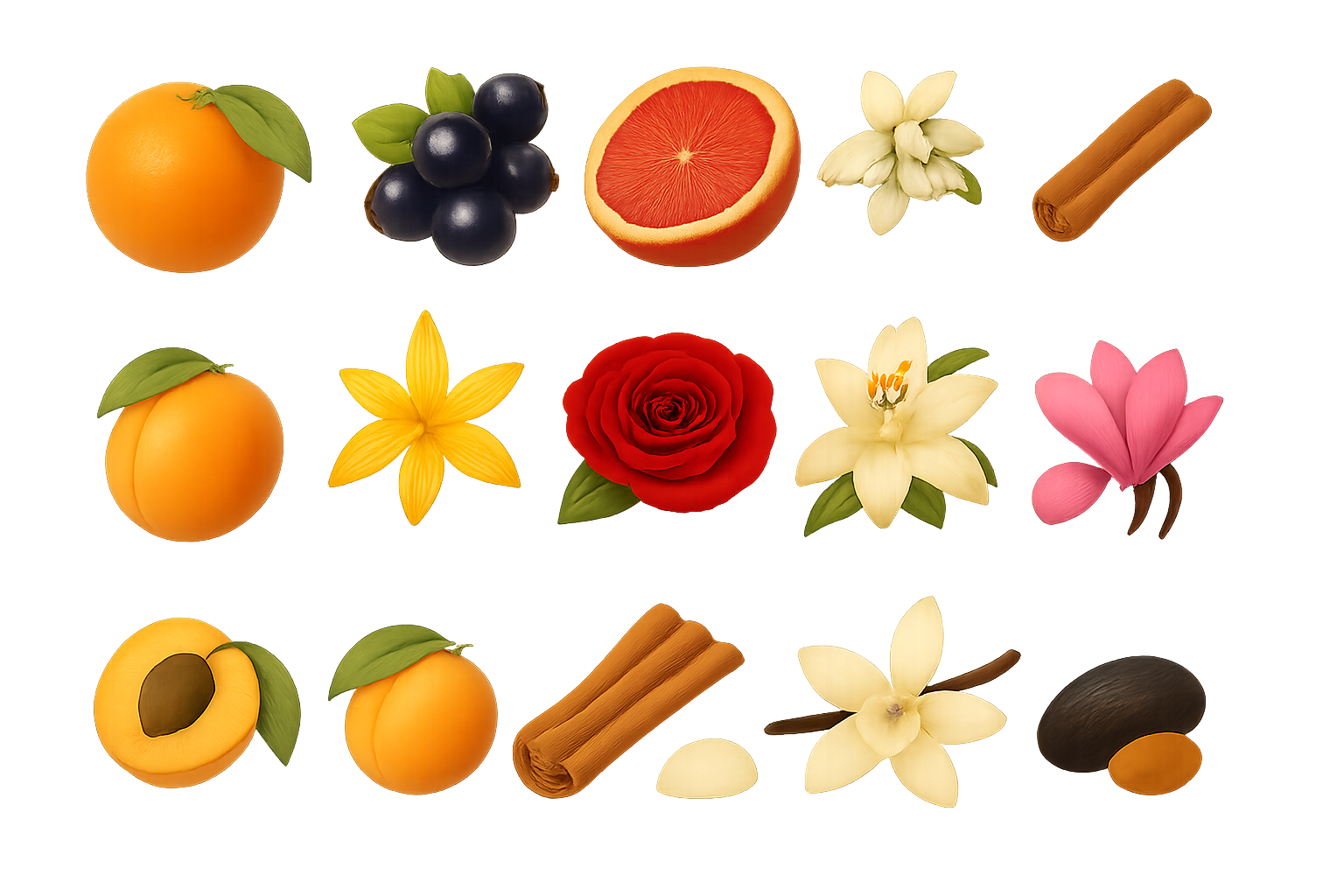 - نتهای اولیه : پرتقال خونی، گریپفروت، نارنگی، انگور سیاه، لیمو، کاسیا